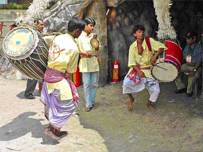 In Bengal people celebrate Durga Puja by making pandals. An idol of the Goddess is put in each pandal and worshippers dance before her to the beat of the Dhak drums.. A Dhak is a cylinder shaped wooden cask with both ends covered with goat skin and cow tails and decorated with feathers. Dhakis are professional drum players. In Kolkata, even a small pandal without a Dhak Bajna performance is unimaginable. Every makeshift tent has a 'dhak and there are over 2000 pandals in Kolkata alone..The festive season starts with Vishwakarma puja and the demand for dhak grows for six weeks, till the end of Kali puja .
