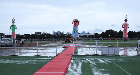 An 80-foot Ravana, a 75-foot Meghnad, and a 70-foot Kumbhakarna effigy were set ablaze amid cheers of “Jai Shri Ram.”
