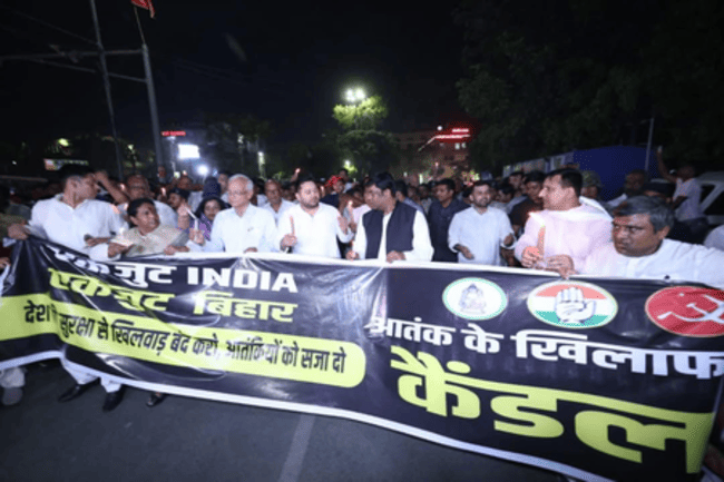 The march witnessed participation from leaders of various Mahagathbandhan allies, party workers, and citizens, all carrying candles in a quiet yet powerful show of unity and national resolve.