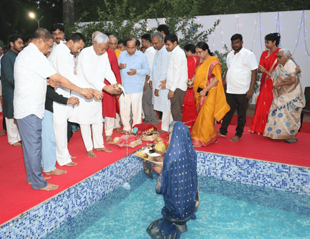 Patna, Oct 28 (IANS) Bihar Chief Minister Nitish Kumar on Tuesday performed Chhath Puja rituals by offering prayers to the rising sun with his family at his official residence in Patna.