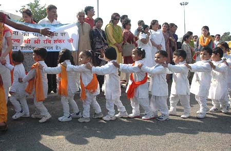 wondered! Art of Living or Art of merry-making !! "Where is the place for us? He is a guru exclusively available for those who have money in their pockets", wondered Ashok Kumar, a paper hawker struck in the traffic jam when Ravi Shankar's car caravan was zooming past on the squeezed streets of Patna. Pix: Manish Sinha To welcome the Guruji some school children all in white dress and red bands across chest with bouquets and single roses in hand were lined up at the Patna air-port but as soon as the Swamiji descended his overzealous devotees and Jai Gurudeo chanting followers made a mad rush towards him. Sri Sri with his waiving hands and flowing beards just entered into his car and whirred past from the spot leaving the little children to be caught and trapped in the chaos thereafter. Sri Sri got the innocence injured at the air-port itself---- or, at least it looked so. The school kids later were seen ruing their fate and some were even on the verge of shock. Art of Living. They call it AoL for convenience. Earlier, to make the visit of their Guru on a wider canvas some model-like girls and chic, polished women danced and made Dhoom-3 to the inscrutable tunes of the satsang on the streets of Patna. Patnaites again felt out of place, alien and so far from the programme and the Guru coming to their city. This
